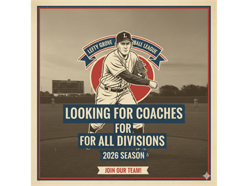 Lefty Grove Baseball League is seeking coaches for every division for the upcoming 2026 season. If you’re interested in coaching, please complete the appropriate Google Form at the bottom of this page for the division(s) you’d like to volunteer for.